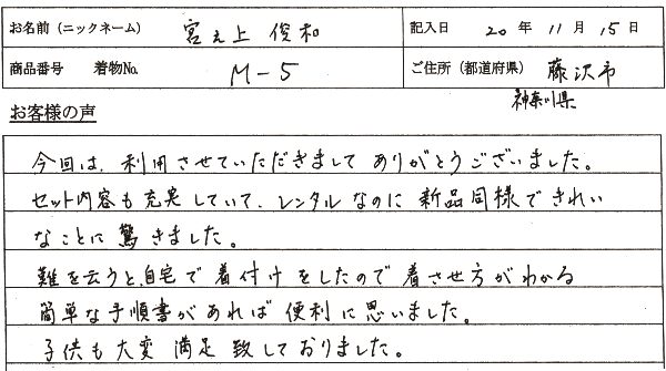 | 喜んでいただき大変嬉しく思います。 弟さんの七五三も是非ご利用下さい。 |