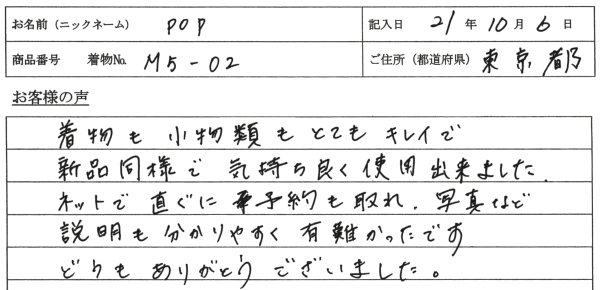 | 今回お届けした衣装は新品でした。いかがでしたか? |